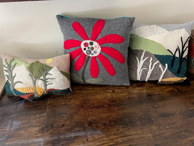I create textile art by repurposing textile clothing frabrics into nature-themed pillows and utilitarian items with whimsy and fun themes to adorn your home.